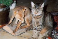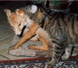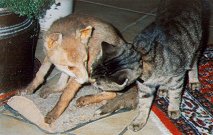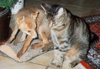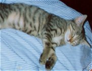 Viel Schlaf hält jung - hier die 2/3 eines Katzenlebens. Als gut gepufferte Unterlage dient ein Mensch. Altersunterschied zwischen beiden: 50 Jahre. |